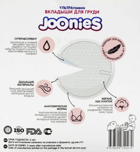 Приятные особенности вкладышей JOONIES: ▫️ Имеют особую анатомическую форму и не заметны под одеждой! ▫️ Мягкий и нежный внутренний слой с ячеистой 3D структурой не раздражает нежную кожу груди. ▫️ Не оставляют ворсинок на коже и одежде. ▫️ Гипоаллергенные, без использования отдушек ▫️ Надежная фиксация благодаря 2 широким липким лентам, крепятся к любой поверхности! ▫️ Диаметр 130 мм, толщина – менее 2 мм. ▫️ Удобно брать с собой – каждый вкладыш в индивидуальной упаковке.